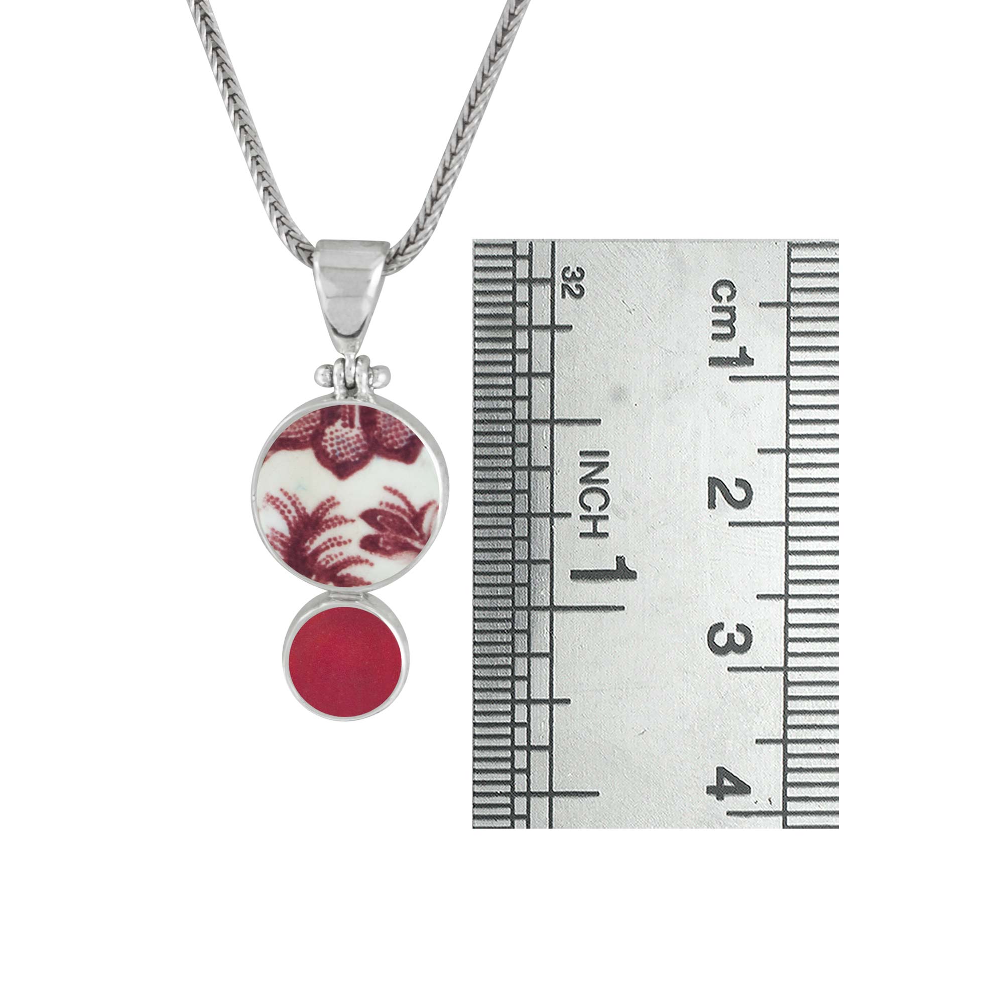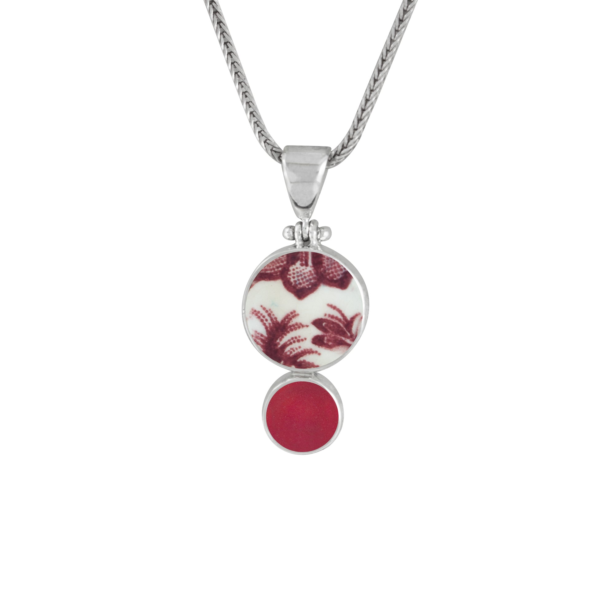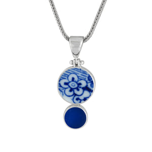 Vintage English pottery shards and genuine sea glass unite in a singular pendant that captures the essence of time-worn beauty. Each piece combines ocean-treasured materials with old-world charm, thoughtfully hand-shaped by our artisans and set in sterling silver. The result is a sophisticated accessory that tells its own story—truly one of a kind, where history meets elegance. Available in 4 color ways- red, blue , green & lavender.